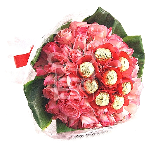 A spectacular contrast of Pink roses and chocolates that can pour sweetness and happiness in the celebrations of your loved ones. Send this versatile treat to your loved ones on special occasions and let them take pleasure in your sensational offerings. This enthralling combination has: 60 Stems of Pink Roses 8 - 10 Ferrero Rochers chocolate Hand Tied by our Florist