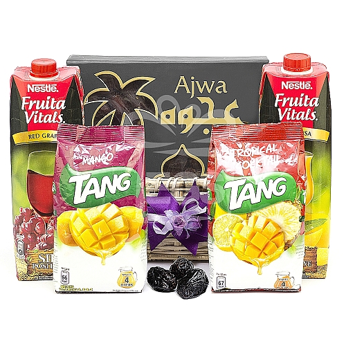 Sending gifts in Ramadan is a long tradition among Muslims. When you are away from home the need to please your loved ones in Pakistan increase twofold. Why not delight you special ones with our amazing Ramadan gift hampers contains delicious fruit juice packs and dates of premium quality. This hamper makes a joyful Aftari treat to start with. Contains: 500 grams Ajwa Dates packed in good quality box Tang 340 grams (mango flavor) Tang 340 grams (tropical cocktail flavor) Nestle Fruita Vitals Red Grape Juice 1 Liter Nestle Fruita Vitals Mango Juice 1 Liter Comes in a basket elegantly gift wrapped and with free Personalised message card containing your customized message on it.