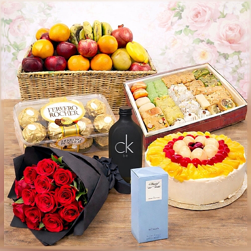Our Special jumbo combo contains 24 ed roses Bunch Perfume of your choice 2LB cake From famous bakers in town 2KG mix mithai From famous bakers in town 7 - 9KG fresh fruit basket Box of Ferrero Rochers 200g Free card and delivery.