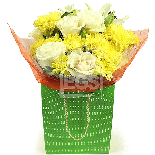 The gift bag with glaring yellow and white blooming florals conveys a thoughtful message of good cheer and positive vibes. Take a flight of life with this splendid basket and highlight that special occasion. Beautifully arranged in a Gift Bag this flower bouquet also features: 6 Stems of White Roses 2 Stems of White Lily 4 Stems of Chrysanthemum