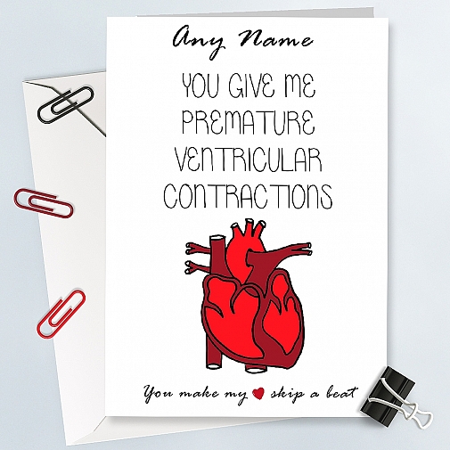 A unique way to express your feelings to your loved one that how he or she make your heart skip a beat. Tell your loved one how it is with this medical inspired romantic card.