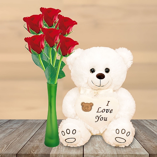 Celebrate the beauty of love and affection with this exquisite combination of 6 imported red roses and a soft white teddy bear — a classic gift that radiates romance and warmth. Each rose is carefully imported and selected for its rich crimson hue, velvety petals, and lasting freshness. Hamper Incuds: